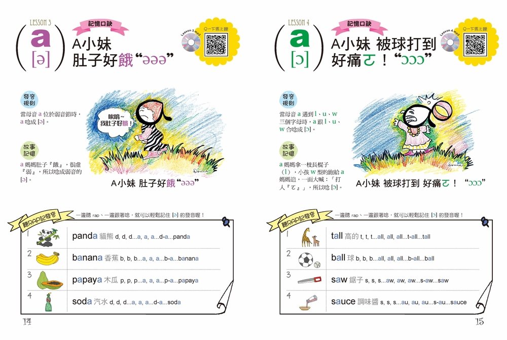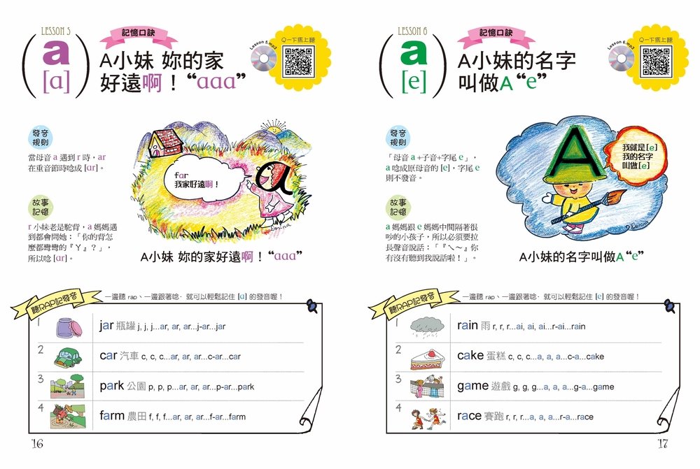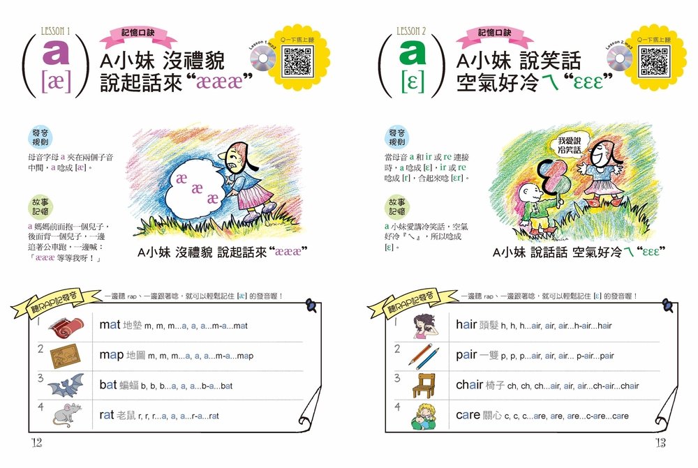 每一個發音都有單字實例並配合卡通圖畫,還可利用MP3、DVD等感官教材引導讀者親身嘗試,在「用眼看、用耳聽、開口說」的過程中,自然而然引發學習興趣,達成潛能開發的目的,培養自主學習語言的能力。