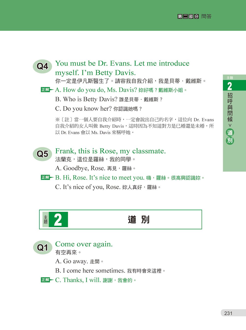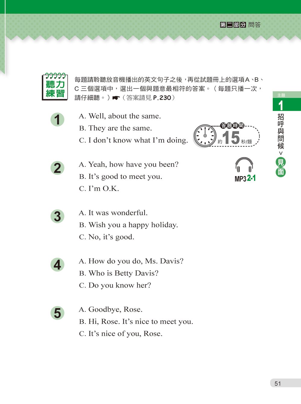 第一部分『看圖辨義』與第四部分的『短文聽解』的題目都不會印在試卷上,只能看見用來出題的圖畫,這些圖畫各不相同,而考生必須先瀏覽插圖再依播放的題目作答,因此判斷出題重點就變得格外重要。本書在每個主題中歸類出『經典問句』與『經典答句』,讓你可以瞬間找出圖畫中的關鍵元素,立刻預測出『下一題會怎麼問?』,在等待中不浪費一分一秒,提升猜題準確率並搶先作答。