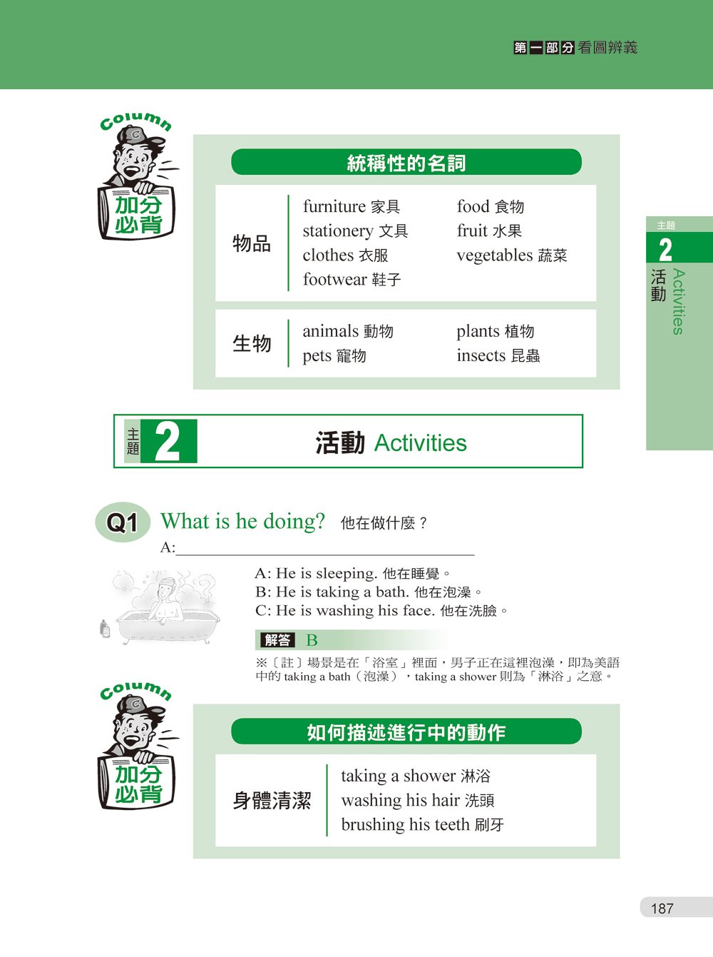本書歸納整理出英檢最常出題的各大生活主題情境,適時補充重點常考高頻率單字、必備句型及慣用表達,讓你快速熟悉該生活情境中最常用到的各式英文表達方式,其中「快速上手句」中的慣用表達句,雖然簡短,卻能切中情境順暢表達,文法、句型不用再死背。不論考題如何變換,都可以順利理解題意、掌握題目走向,英文解讀能力得到提升!
