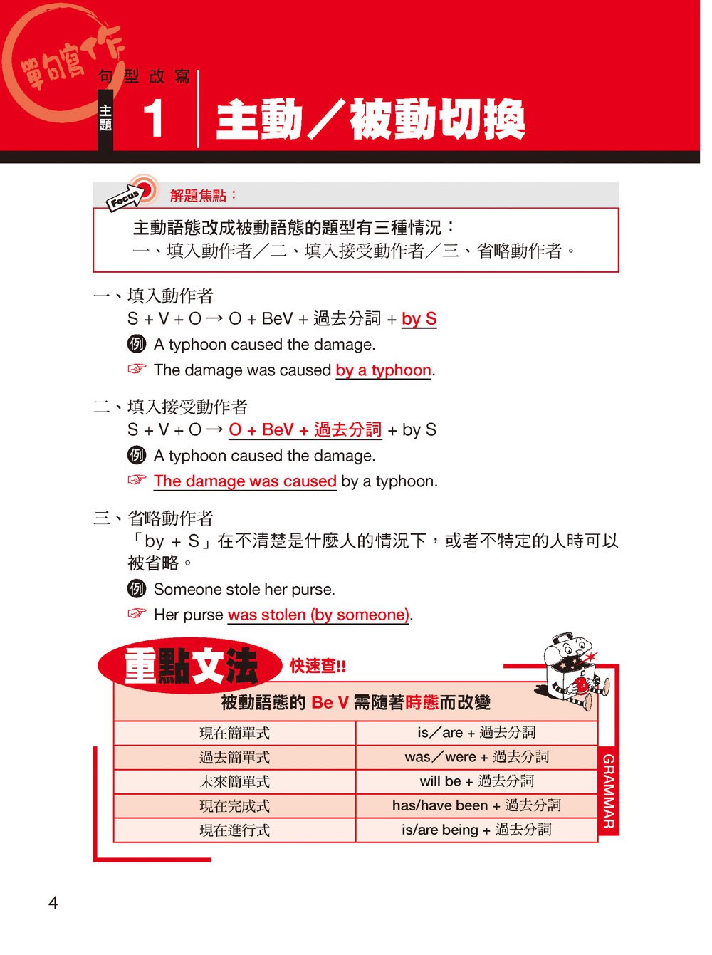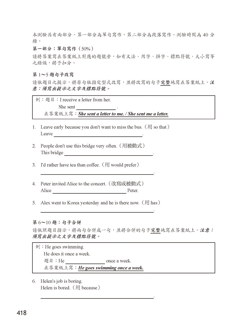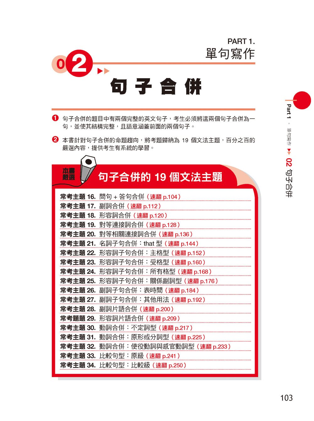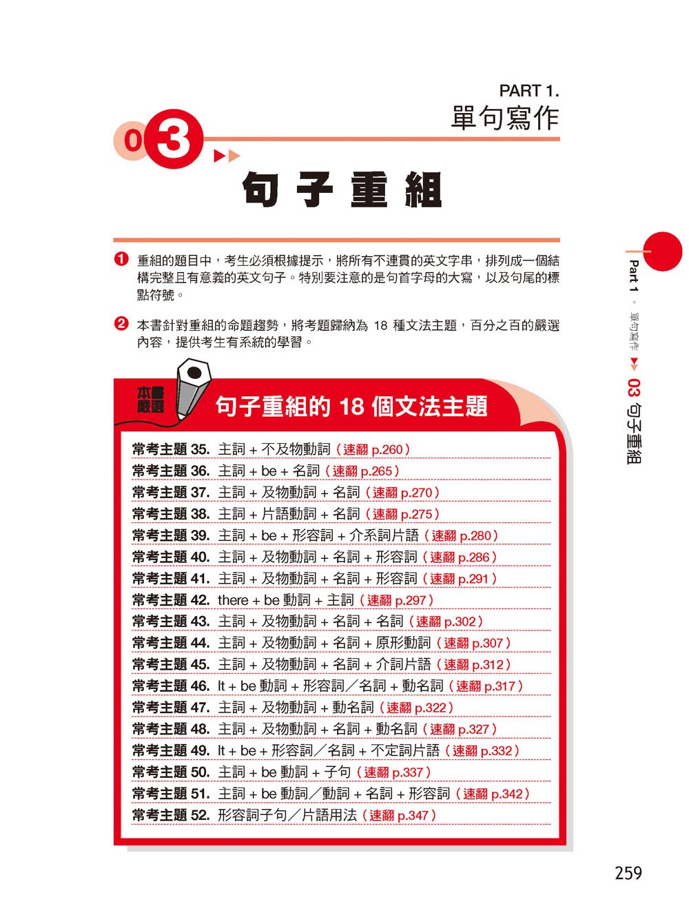 主要在於測試考生的文法寫作概念。本書在第一部份共有52個常考主題,每一個主題都有「解題焦點」,以條列方式清楚點明解題關鍵,幫助考生快速找出解題的線索;「重點文法快速查」以一目了然的表格整理該單句寫作題型必備的文法觀念,迅速補充考生的搶分能量;「實戰演練」嚴選千道考題,提供考生完整且有效率的題庫練習,藉著將解題焦點活用在分類的單句寫作中,訓練快速且正確的解題技巧,進而把寫作變成一種自然反射能力。考生在熟讀第一部分之後,對於必備的寫作文法概念已然駕輕就熟,就可以把所學到的構句技巧運用在第二部分「段落寫作」中。