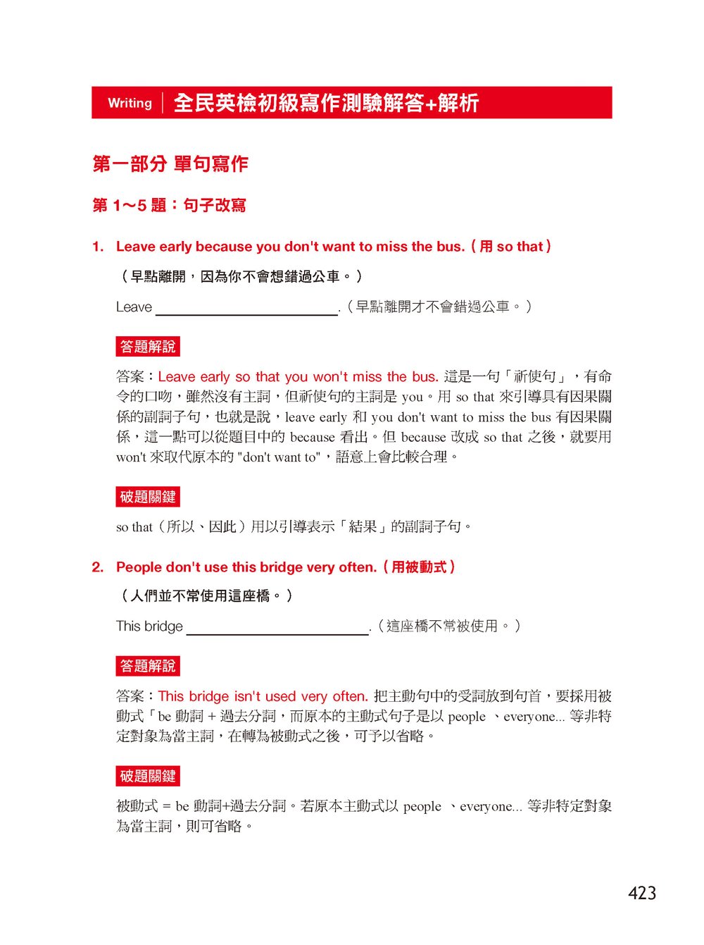 針對初級程度,以最常考的主題情境嚴選的「實戰演練」的題目提供考生完整而有效率的寫作題庫演練。透過「解題焦點」的活用,有效訓練快速解題的自然反射力,讓你看到題目就想到答案!
