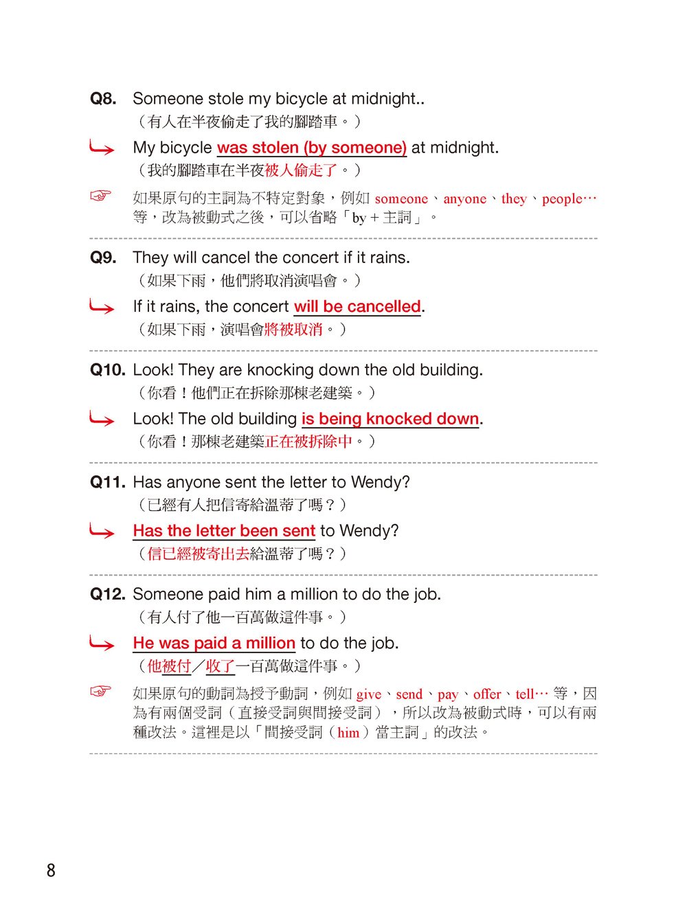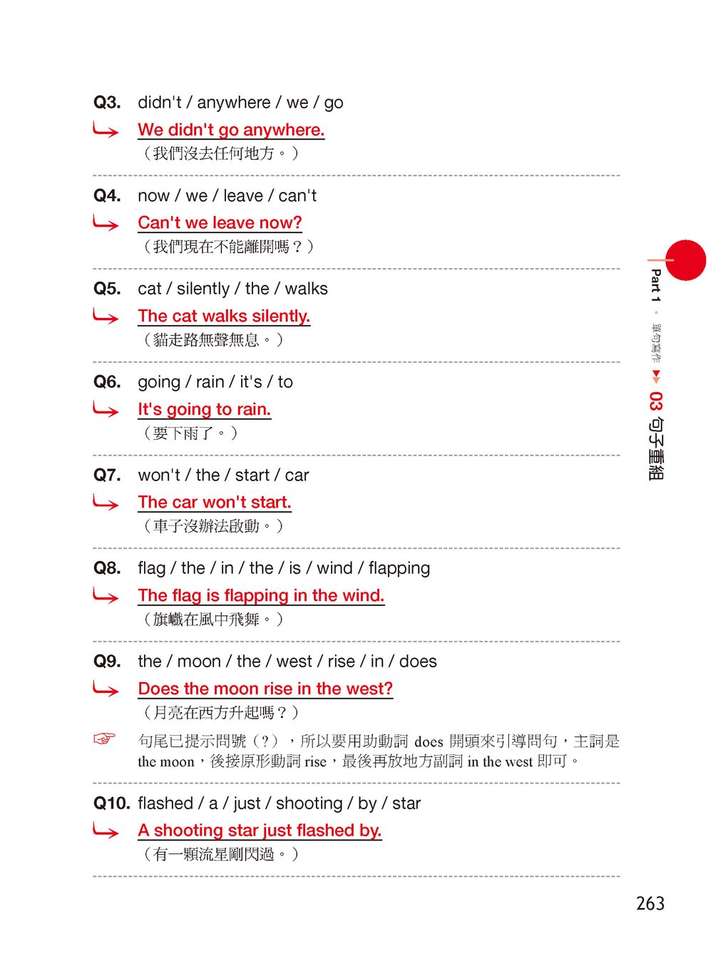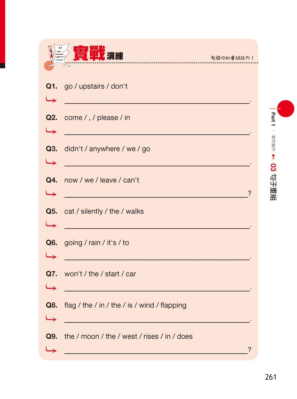 2. 完全掌握寫作上的詞彙及文法重點:針對各個寫作常考的題型,整理解題所需的各類文法規則,且幫你找出可能出錯的地方。