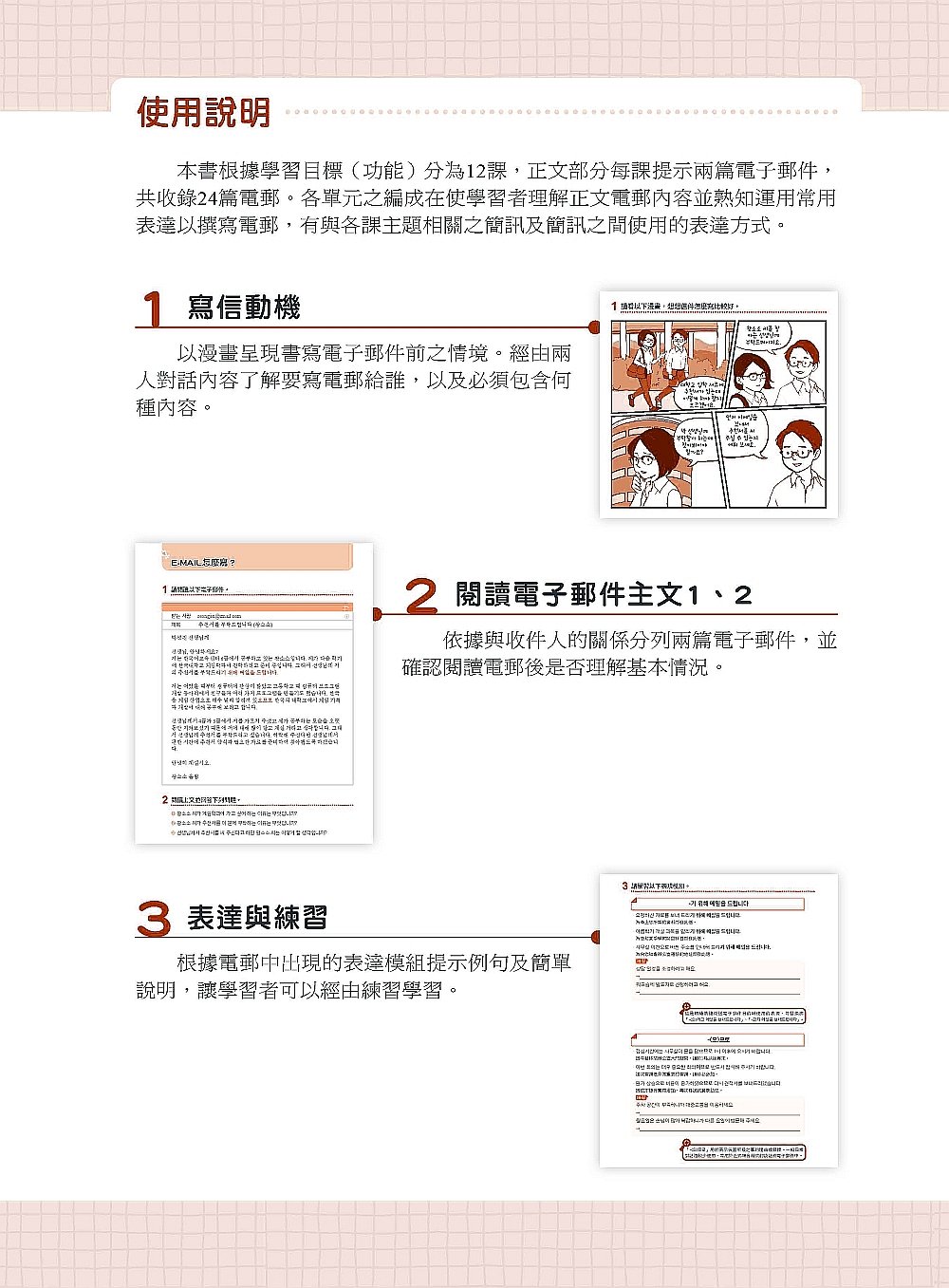 每一課開頭都會先閱讀寫信動機的漫畫,了解大概之後,就可以閱讀主文電子郵件,也就是課文部分。讀完課文之後,讀者可透過下方練習題了解自己是否確實理解課文內容。接著便可練習使用課文中出現的表現做套用模組的短句練習。學完課文之後,會需要讀者活用學到的表現實際撰寫一封E-MIAL。讀者在這個過程中,還須試著閱讀書中提供之其他學習者撰寫的E-MAIL,確認是否有錯誤或語句不自然的部分。換句話說,就是改錯練習。接著讀者需看著提示內容將這封E-MAIL重新謄寫一次。透過這個方式確認學習內容並加深學習印象。每一課最後都還會提供與課文E-MAIL有關的訊息,同時說明簡訊中的常用表現,希望這樣的練習對學習者有所幫助。