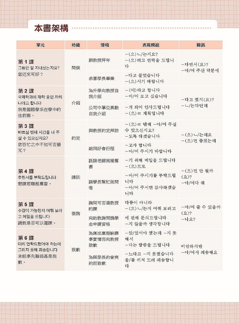 韓語不好的人不一定寫不好一封電子郵件。韓語E-MAIL有其固定格式,只要依照架構書寫,基本上已做到保底程度。本書的眾多範例讓讀者自學,也能學會如何寫一封盡善盡美的韓語E-MAIL。即使找不到老師批改也能學到一定的程度,配合老師的修改建議,則可以學到更多。