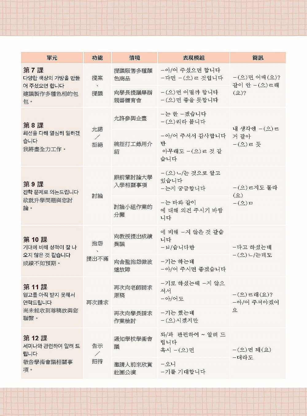 由於書中將12大功能類別循序放進內容當中,每課也有相應的重點表現模組,因此在教學上非常便於安排課程進度。此外也有單句練習以及一篇完整E-MAIL的全文練習,可以輕鬆的分派作業,並從學員的作業中了解目前的學習效果。