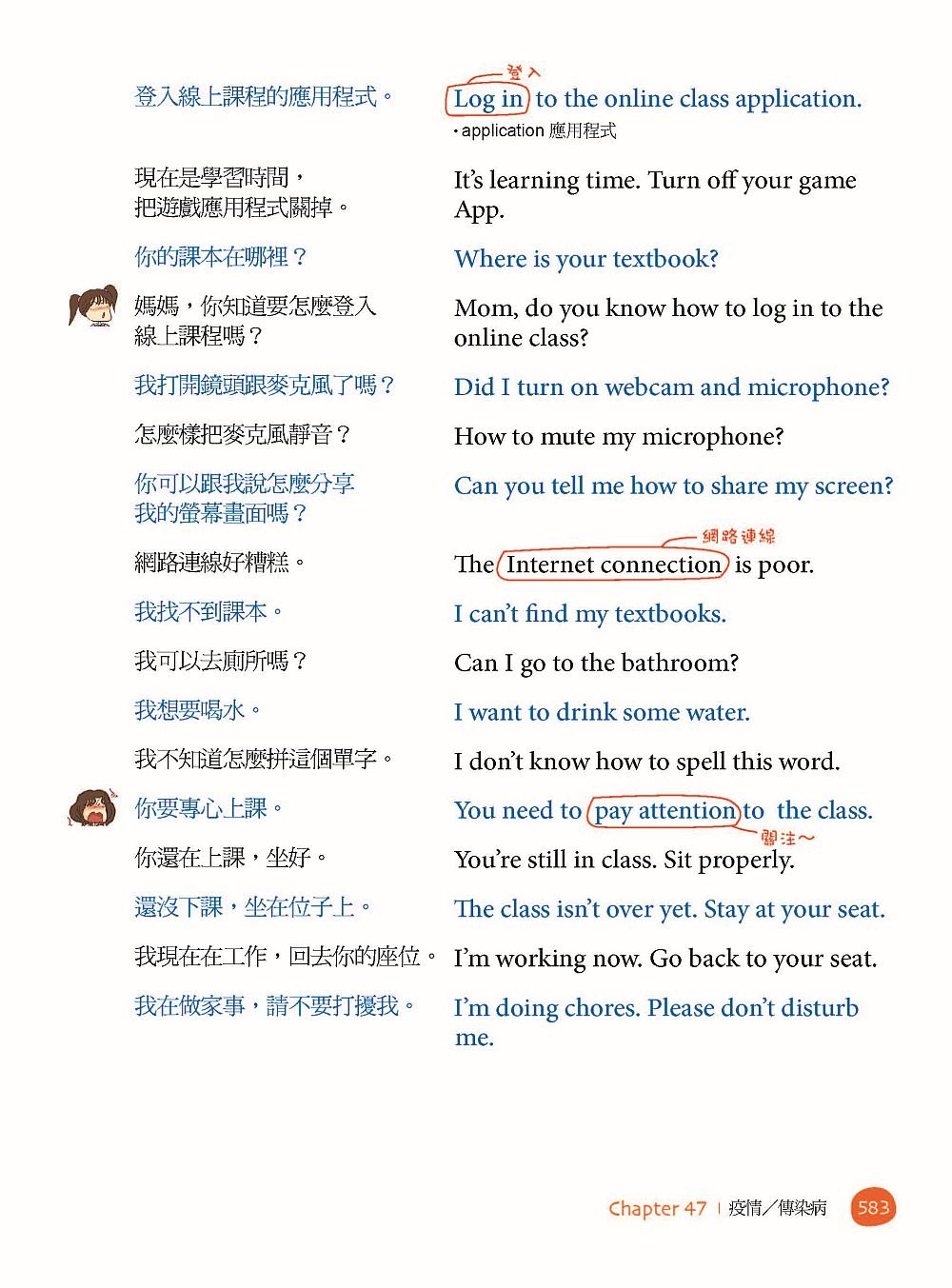 - 收錄句子範圍最廣!連跟外師溝通、老師在課堂上常使用的英文,本書通通有納入,不但可以跟孩子用英文從起床講到睡覺,還能用本書跟外師溝通,或者直接當孩子的安親班英文老師