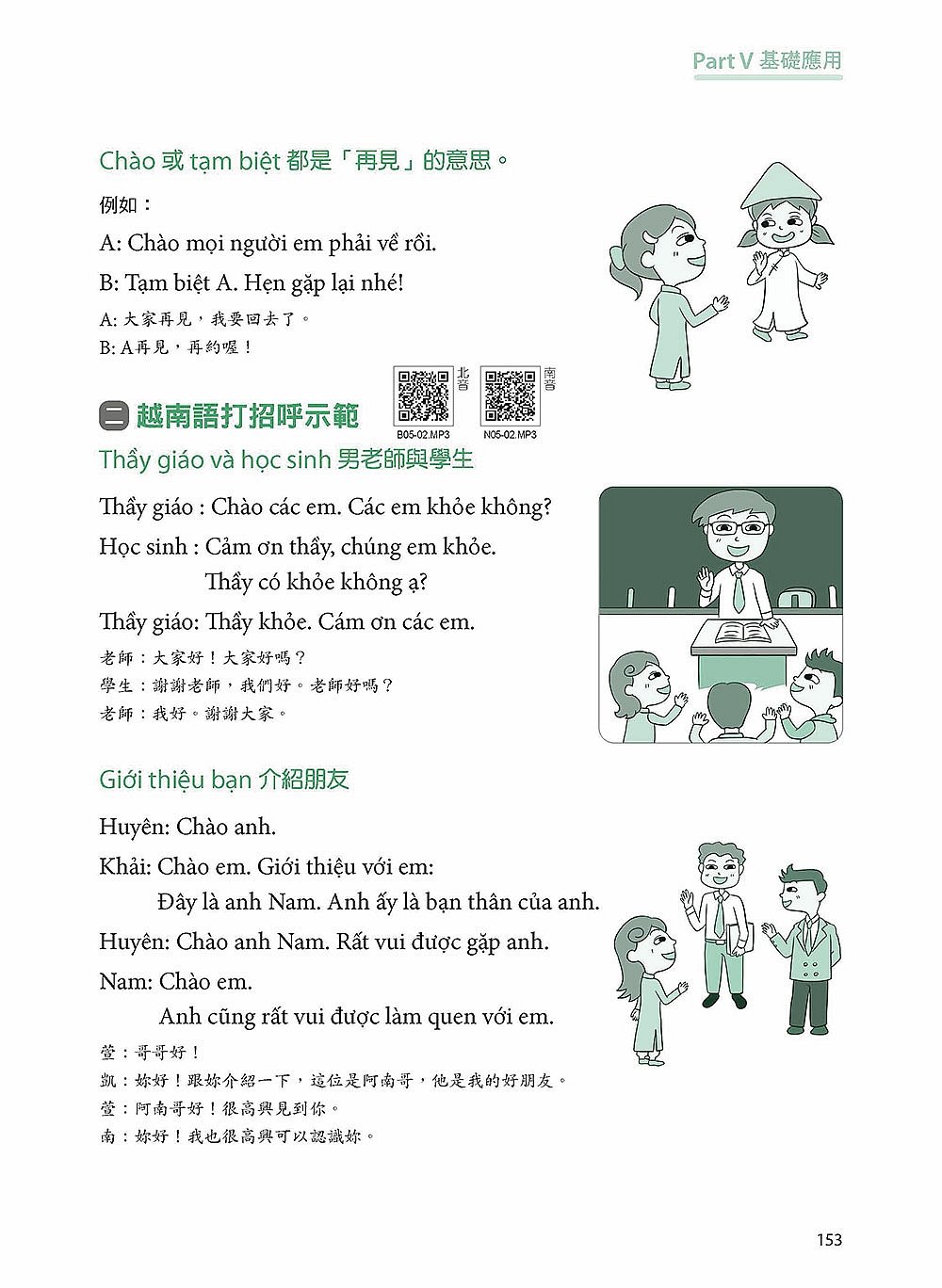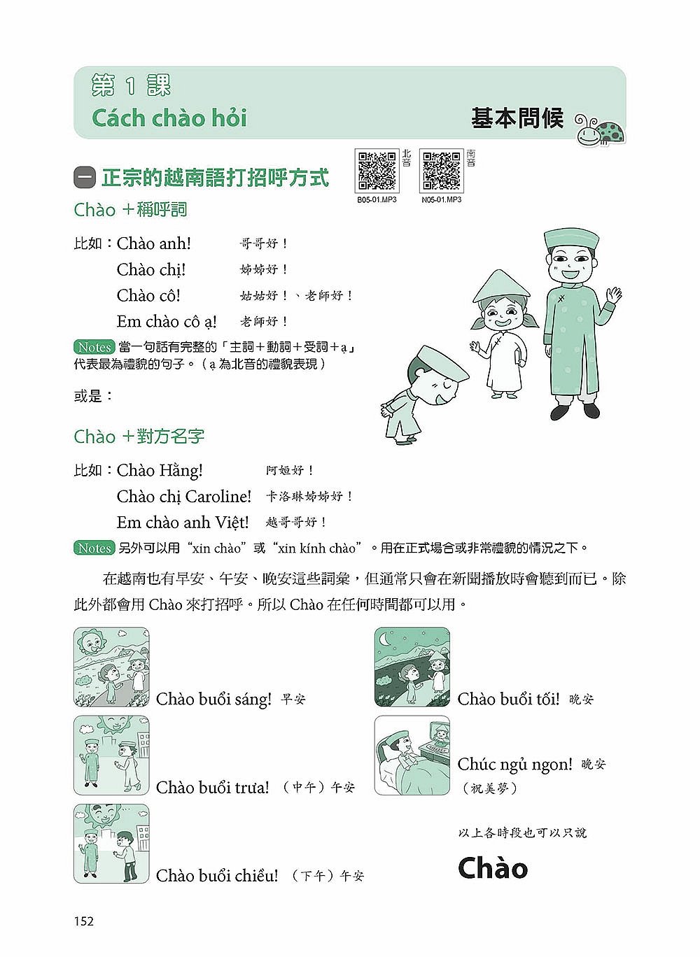 本書並不是教完越南語發音就沒事了!在發音全部都學會之後,不學一些簡單的表達應用怎麼行!本書還準備了越南語的基本會話及表現,只要發音全部學會,學會這些新課都不是問題: