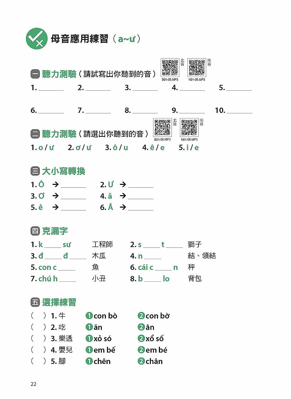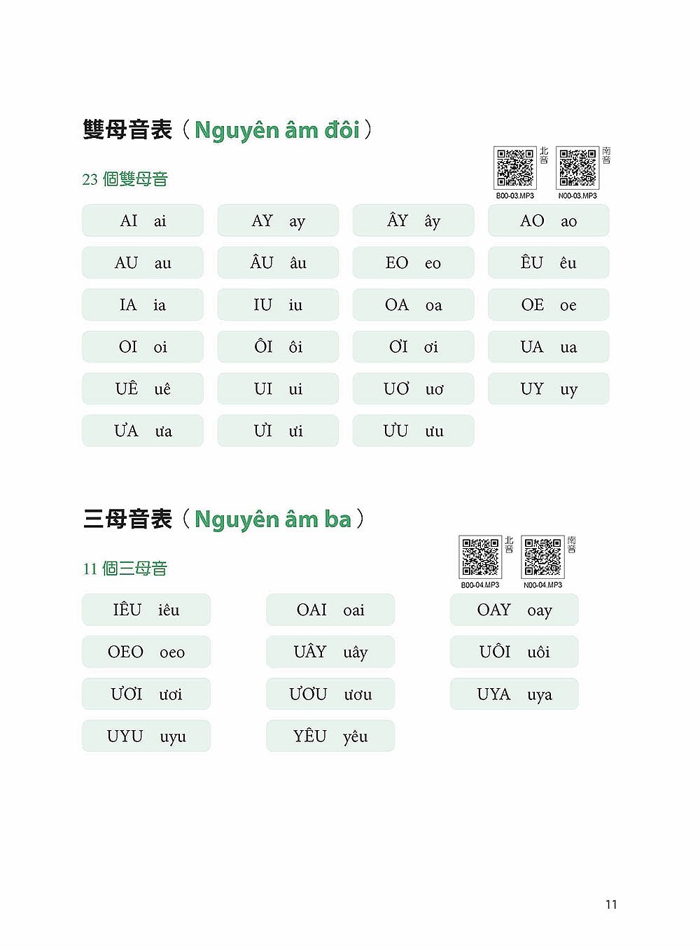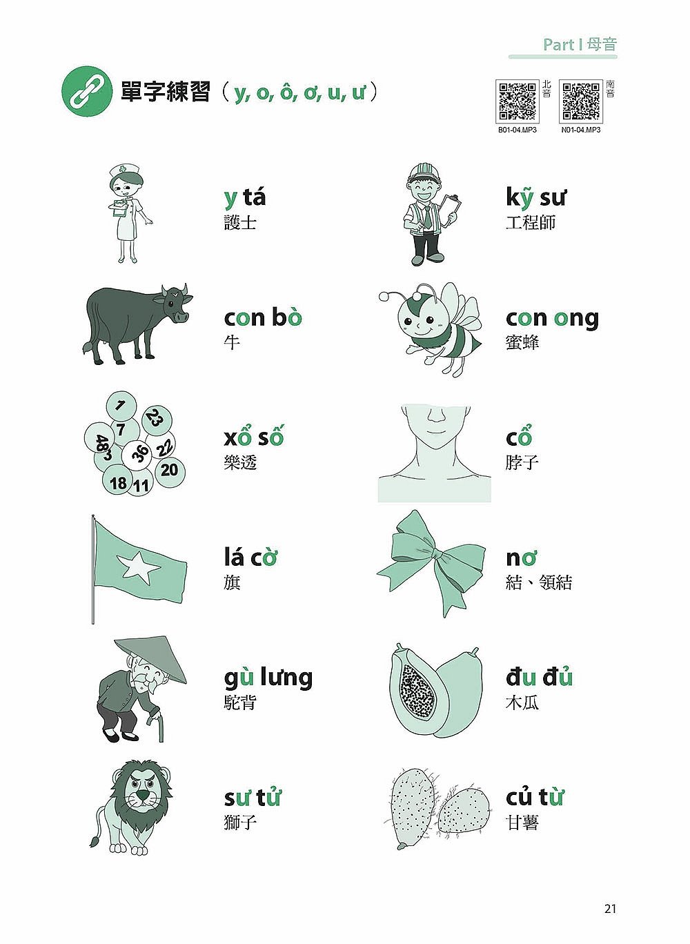 越南語中的北音、南音這兩大應用音系各自分明。故本書為了便利你的需求,所有內容同步收錄北音、南音的錄音及字彙、練習。不論你學習越南語是為了去北越還是南越,本書都能完全滿足你的需求。