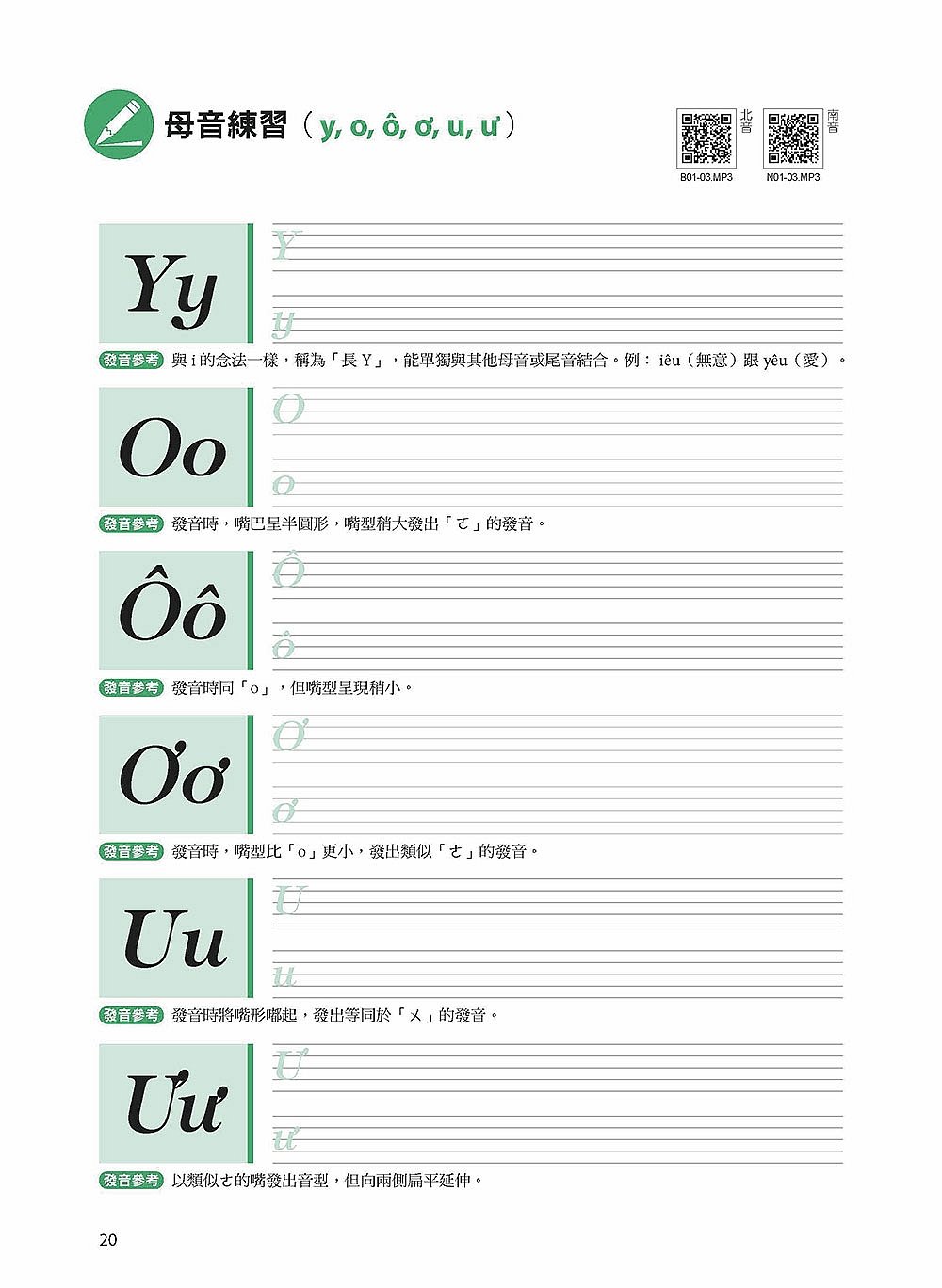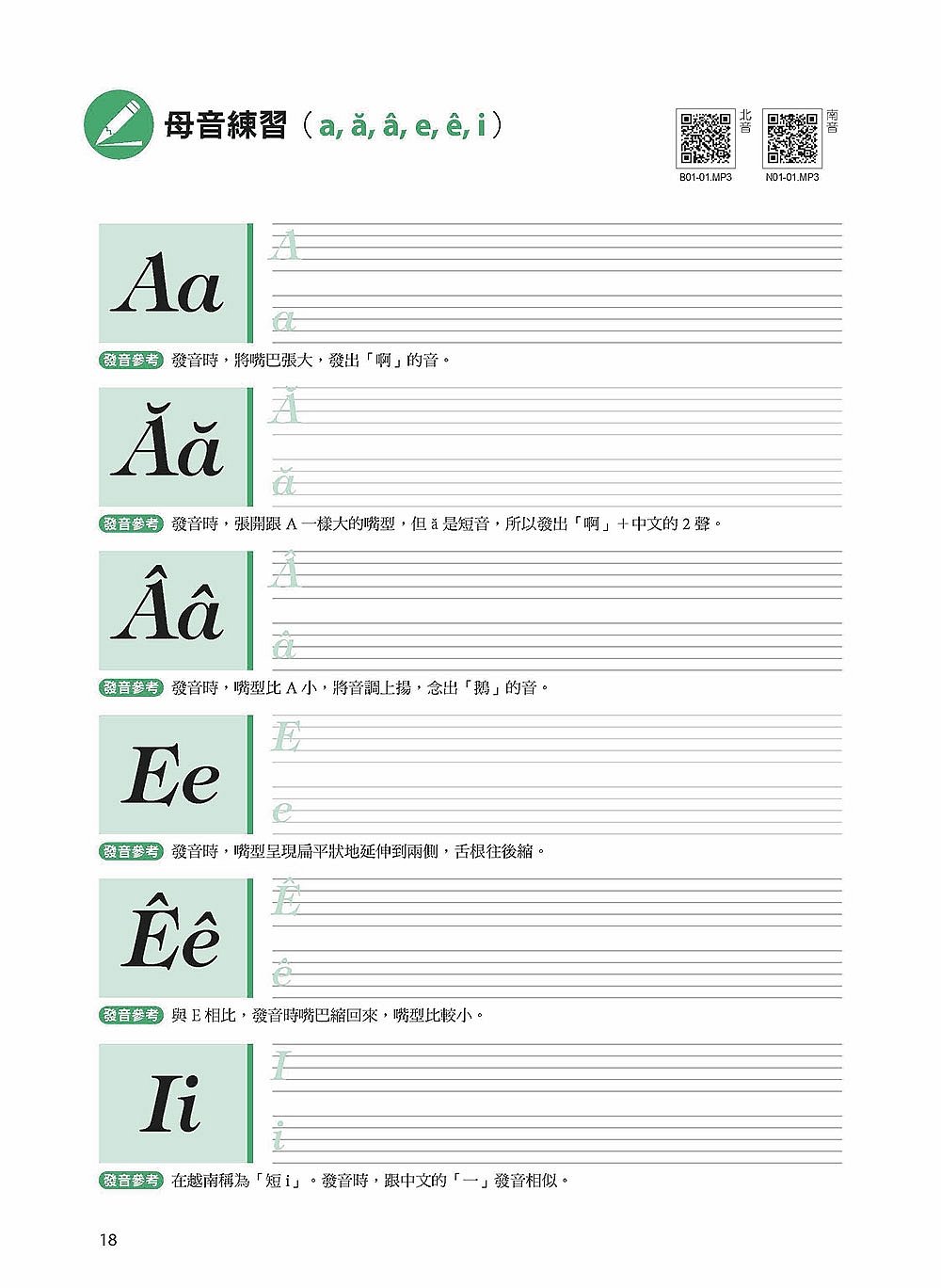 每一個越南文字母除了可聽線上音檔之外,皆附有【發音參考】及【習字帖】。透過發音參考裡的發音說明引導及親手書寫練習(包括大寫及小寫),即可加深印象,便到全方位的學習效果。