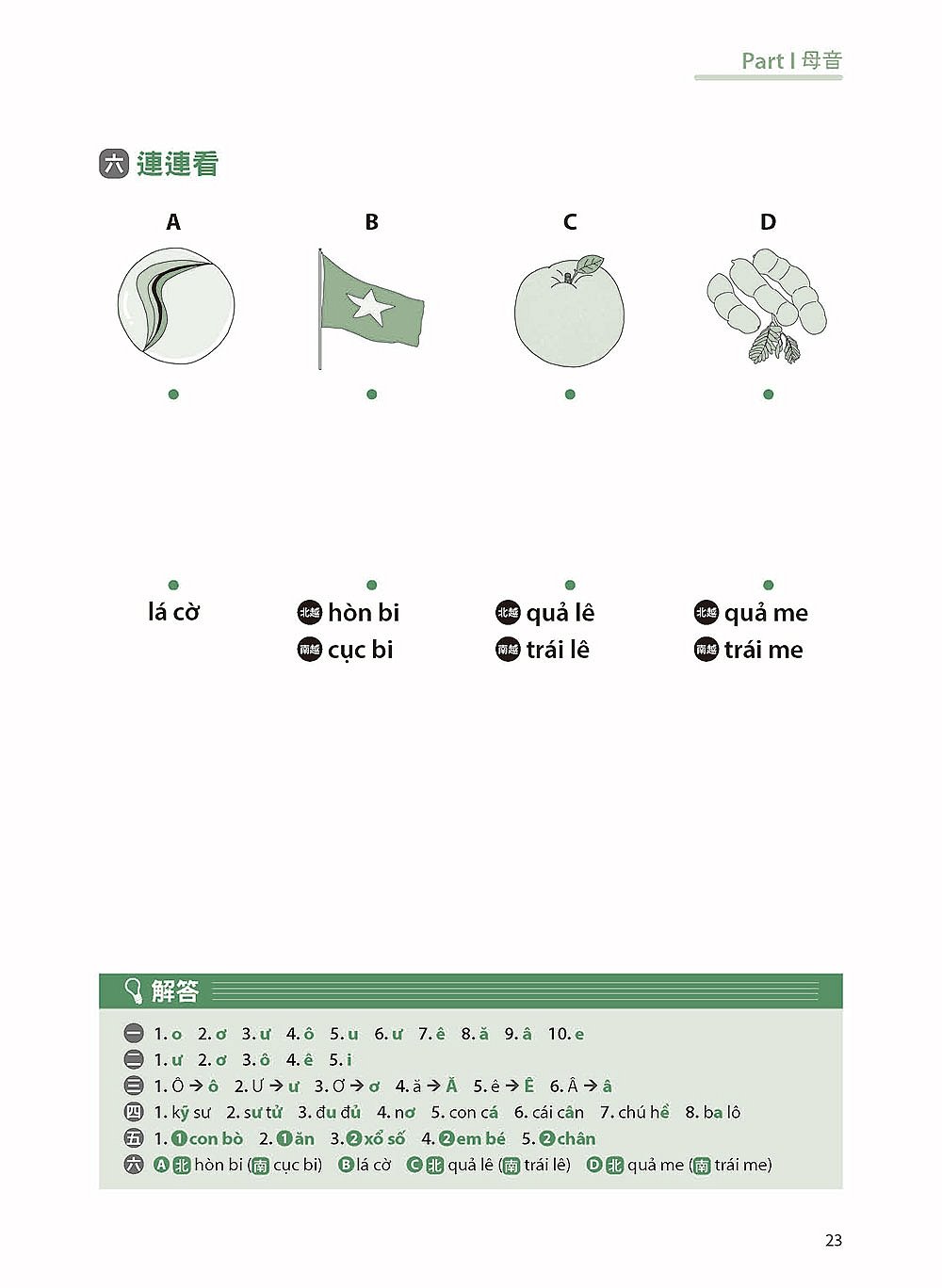 字母學成後,如果沒有意義,要記並不容易。所以每單元書中習字帖的右頁,馬上有用所學字母拼出來的越文單字,並且有該單字的圖解以加深記憶。不但能學到新的單字,也能在學單字的同時,依其結構強化對字母的熟悉度。