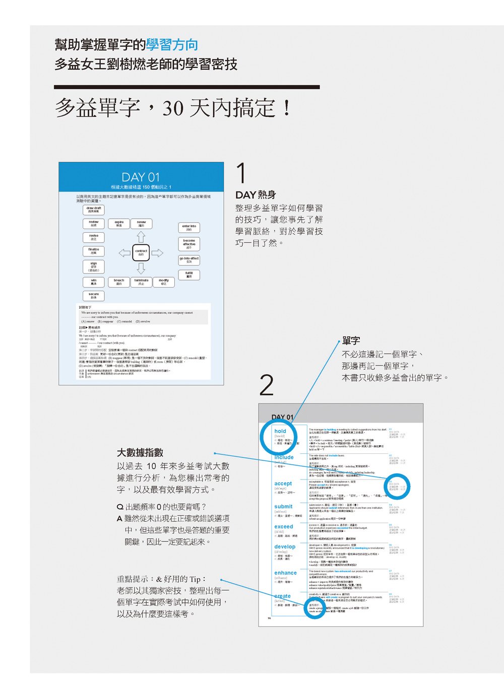 了解了單字的重要性,是不是隨便一本單字書就可以幫助我們考多益呢?當然不是!英文單字的範圍廣大,能準備考試的時間這麼急促,當然要選一本收錄單字被出題的頻率高,而且清楚分析各單字在多益中考法的單字書。「多益滿分考生製造機」的劉樹燃老師,以她17年多的教學經驗,特別挑選了1200個多益必考單字,讓你用最短的時間、背最少的單字、得最多的分數!不再漫無目的地拿著一本又一本厚厚的單字書狂啃!