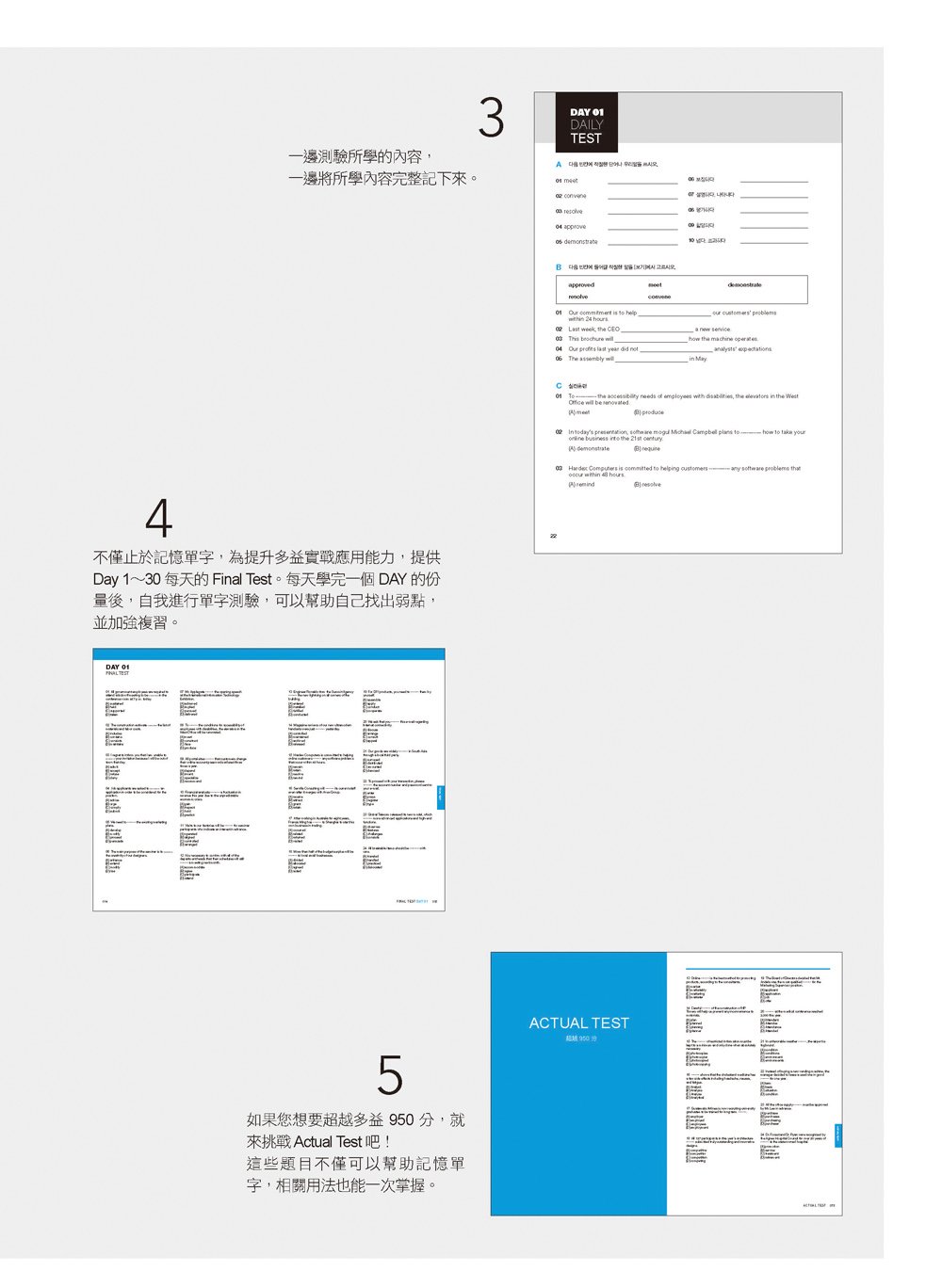 這本多益單字書,要給您意想不到的快速學習效果!只要你配合本書中的四大階段循序漸進,就能體會到連自己都會害怕的實力提升!從 STEP 1 的「基本核心單字的記憶串連術」開始,經過 STEP 2 的「字彙能力提升術」、STEP 3 的「功能性字詞強化字彙能力」,到最終的模擬試題測驗,由淺入深,按照正式考試時的出題順序,從最基礎多益題型開始練習,逐步增加難度。先以基本題型鞏固實力,再引導你進入偏難的加分題,累積更高的分數。本書就像是一位循循善誘的家教老師一樣,給你明確又親切的解說。堪稱最具實用性的多益單字書,也可以讓你輕鬆自學,一步步突破自己!