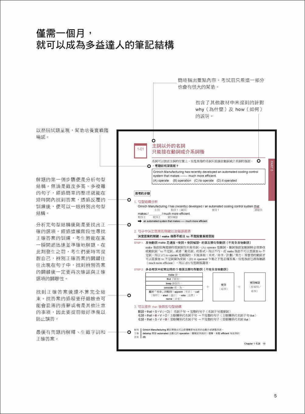 文法書有一個特點,用得久的多半又厚又重,輕薄短小的用完就得丟。本書結合兩者的特色,運用精簡的篇幅,讓你漸漸累積文法實力,看長篇文章也不頭痛,更讓這些能力一輩子跟著你,就算日後不需要考多益了,文法能力還是不會離你而去!這次學會,終於可以用一輩子不用重頭來了!