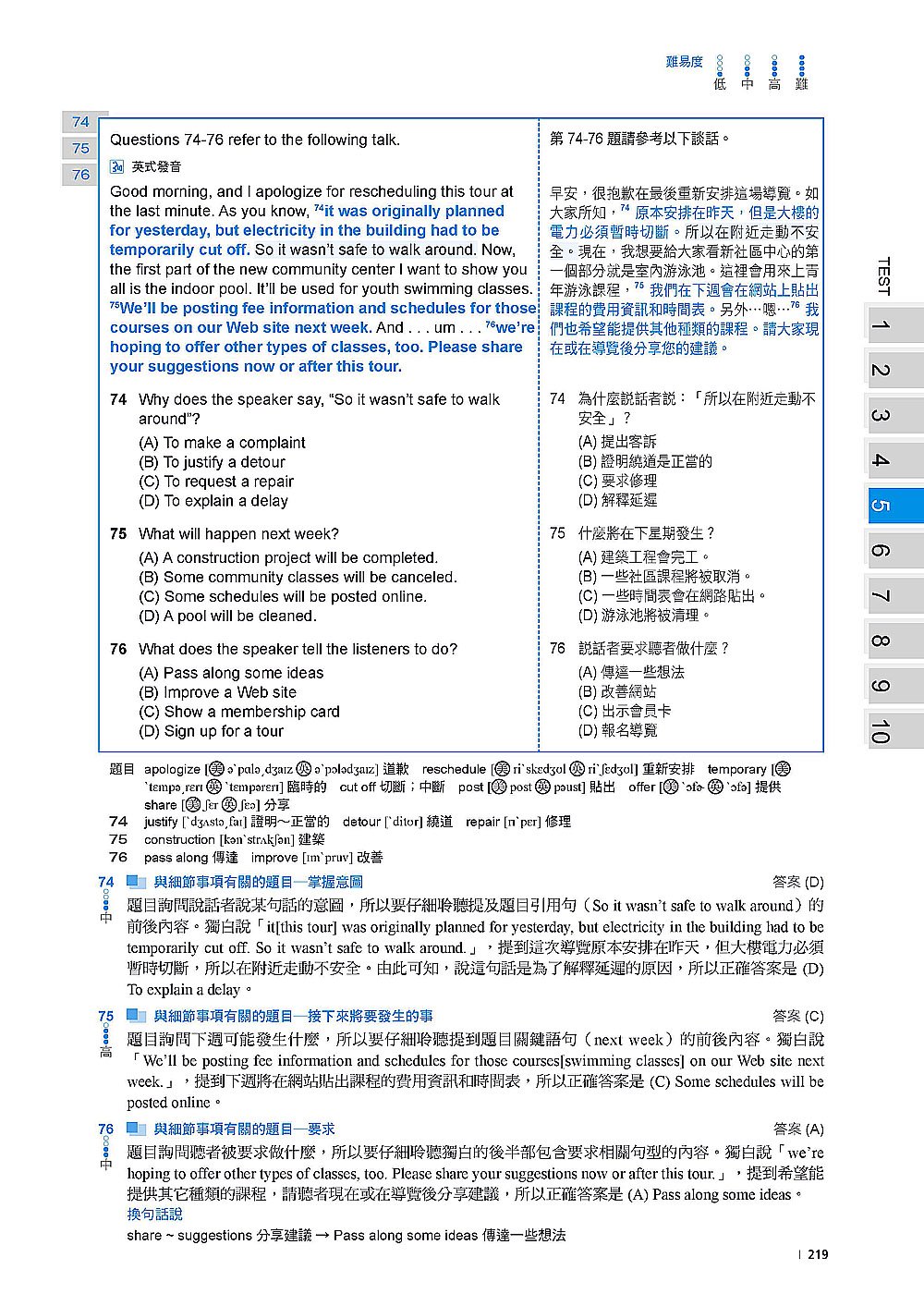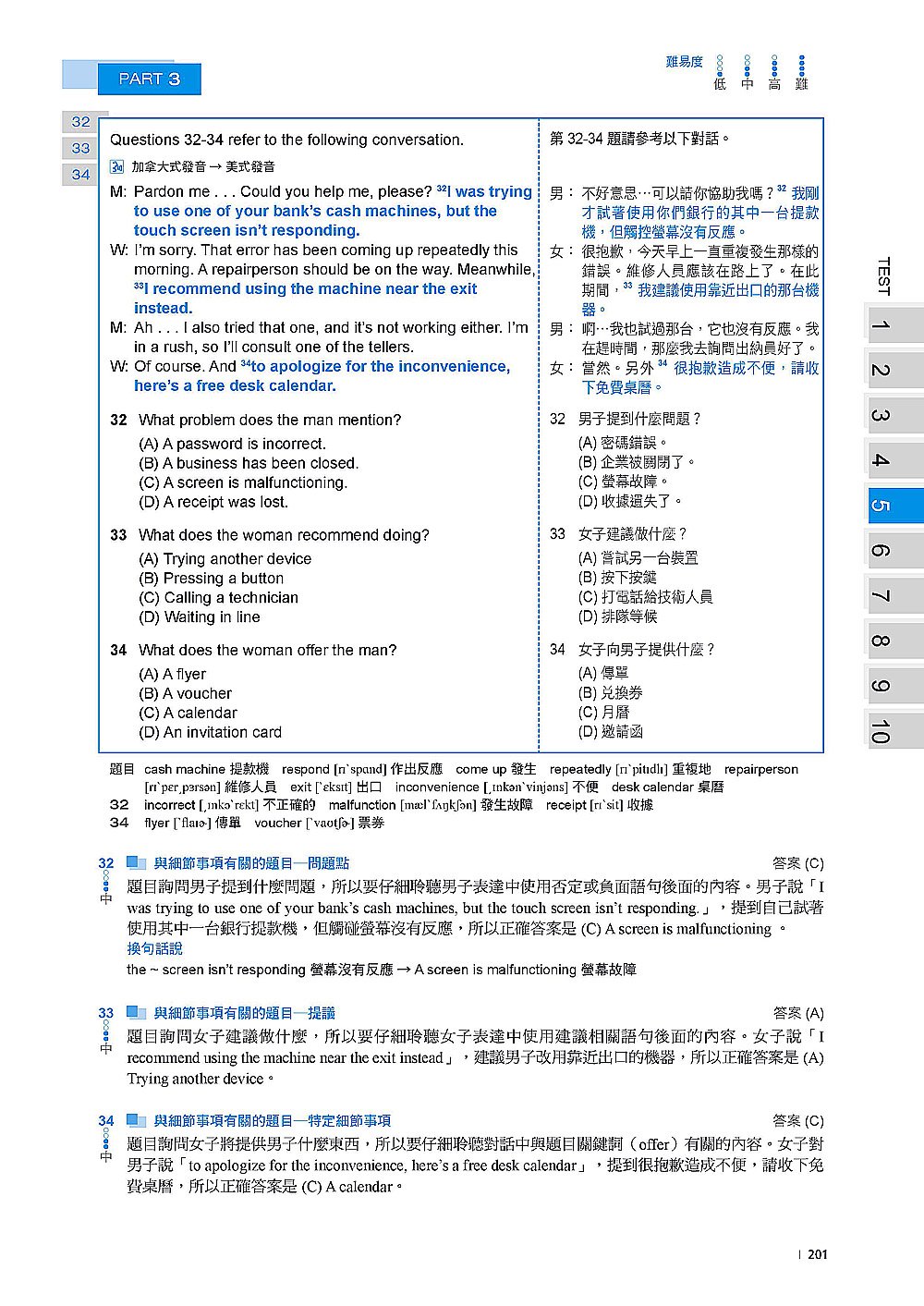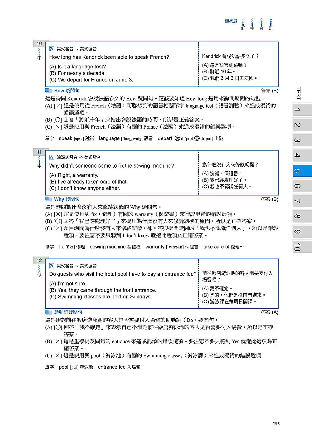 解析本的每一題均清楚標出題目類型及中文譯文,並按照各個題型在詳解中提出最佳解題策略,讓你能透過反覆練習建立「解題 SOP」,真正測驗碰到類似題目就能直接套用解題方法,運用最佳策略作答,在考試中的效率和正確度自然提升!