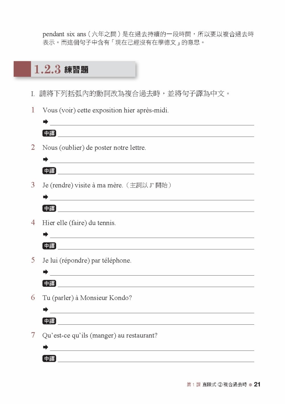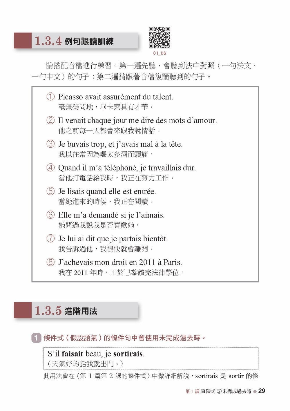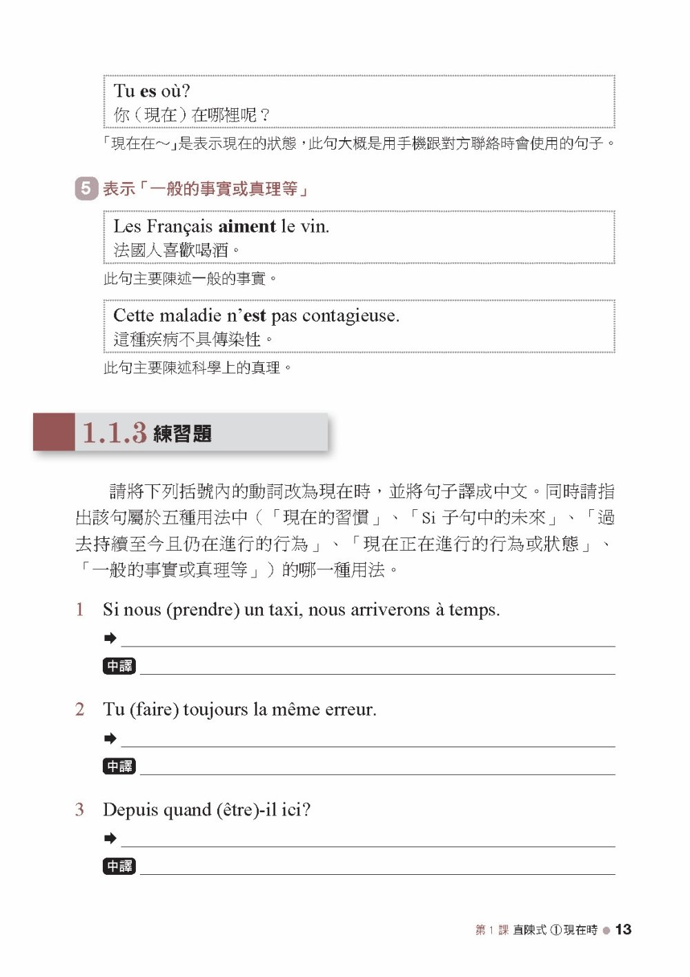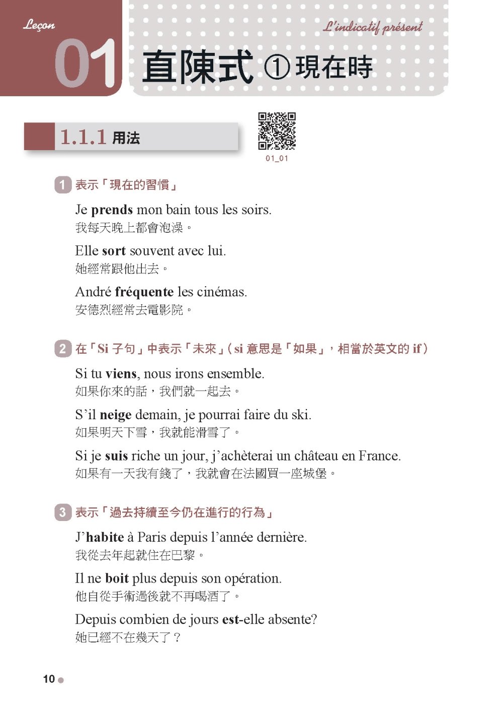 透過本書的填空題練習以及法翻中練習,除了即時確認所學,還可加強自己的法語理解能力。 如果在練習題目時,發現有不懂的地方,請翻到前面解說的部分再複習一次。