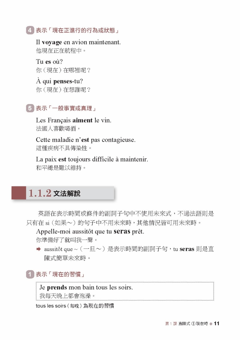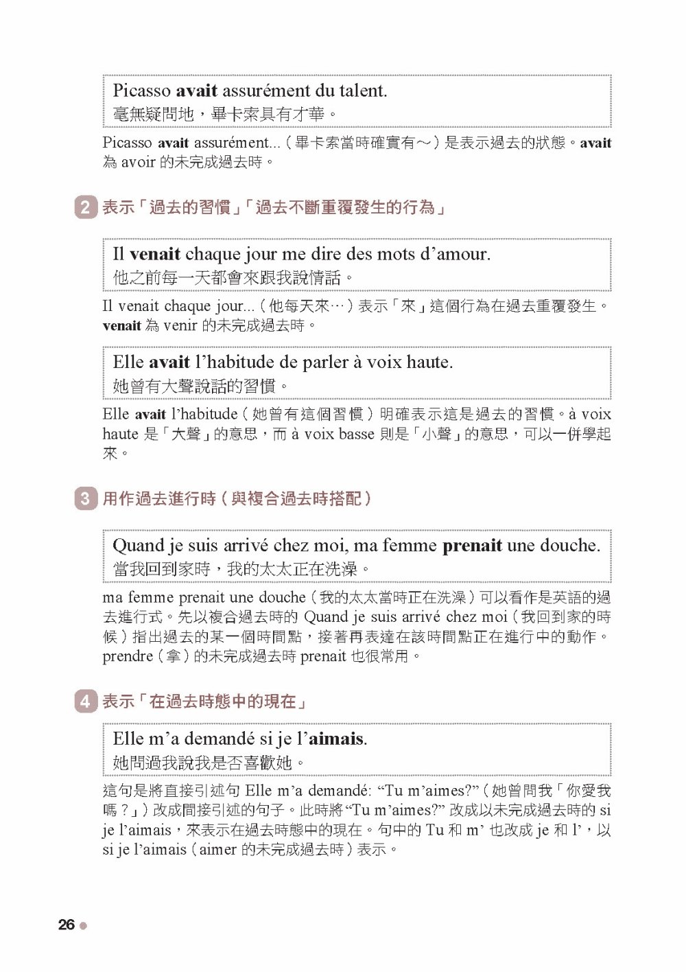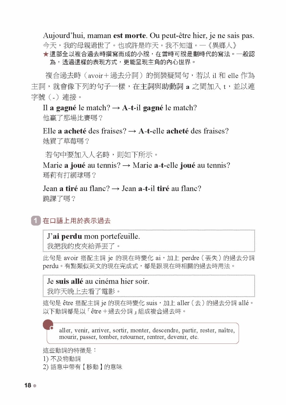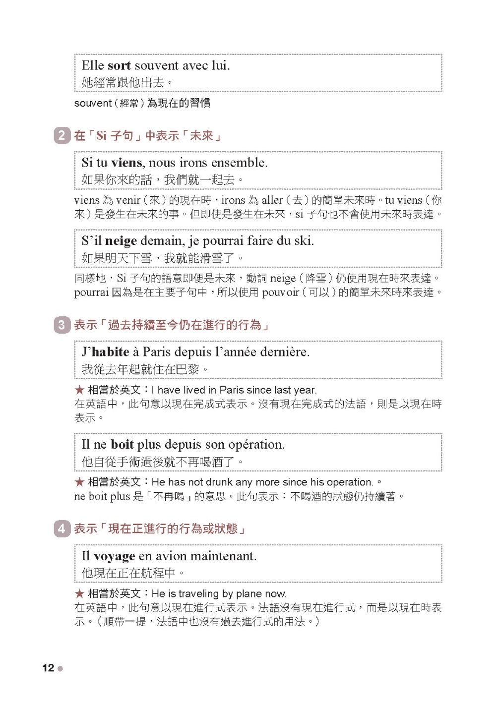 除了一般文法書會收錄的文法概念外,本書還整理了如文學作品中才會出現的用法,以及比較細微、難解釋的表達方式,讓你的法語程度就此脫離初級,提升到中高級程度。比如在小說中,在以過去時書寫的敘述中突然出現「直陳式現在時」的話,那可能是表示說話者的內心獨白。