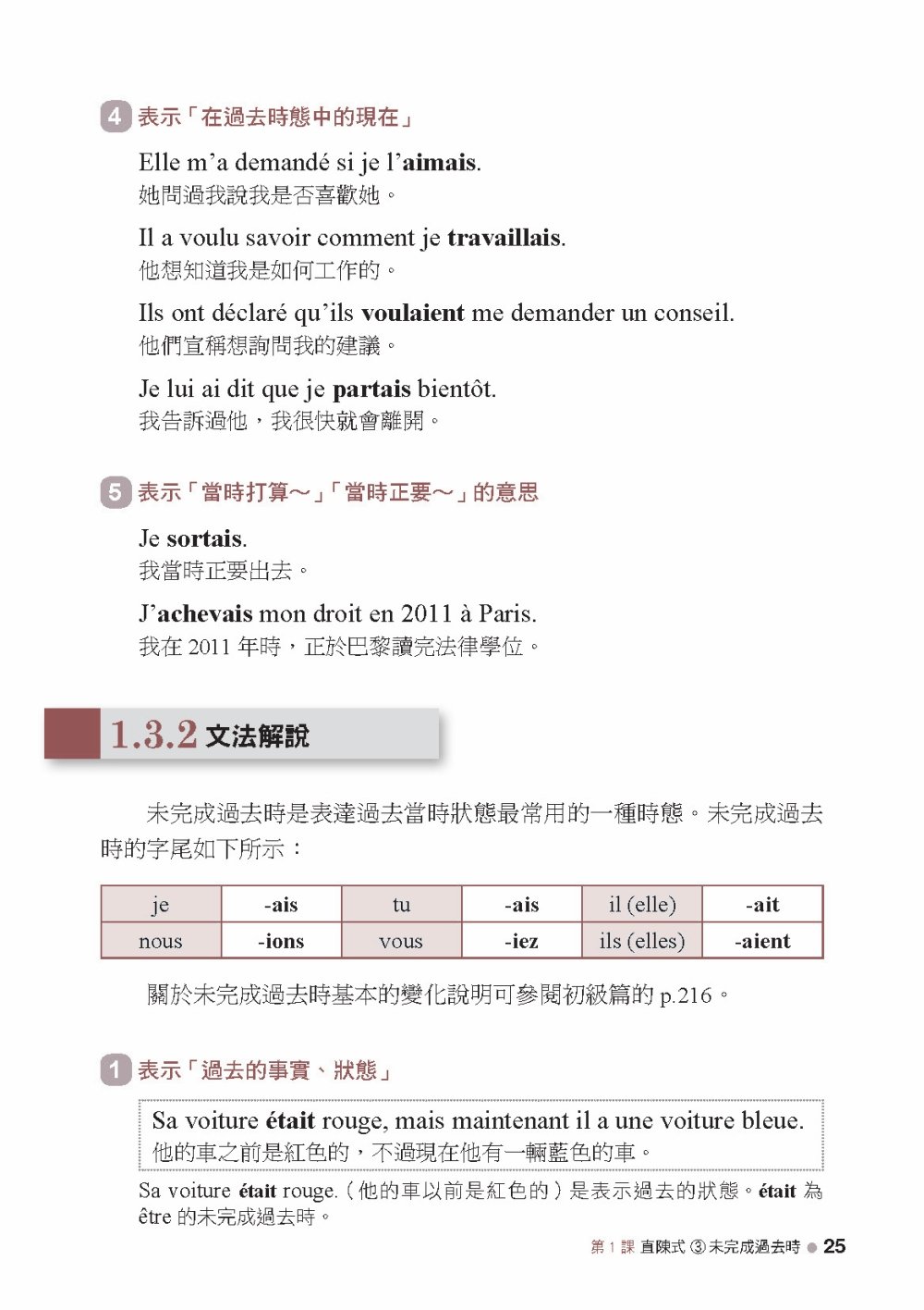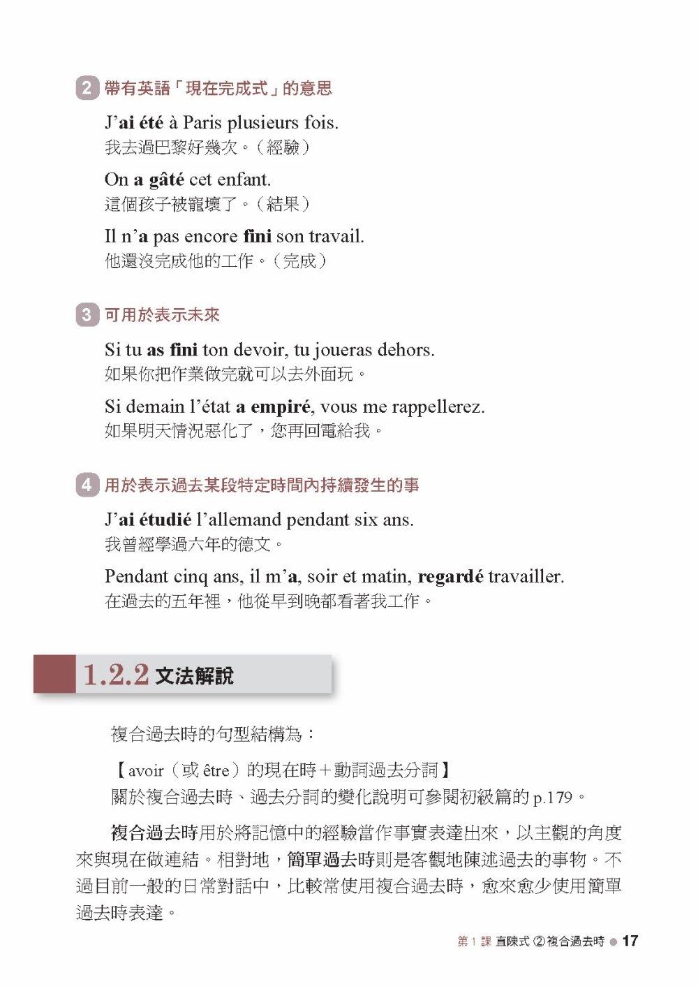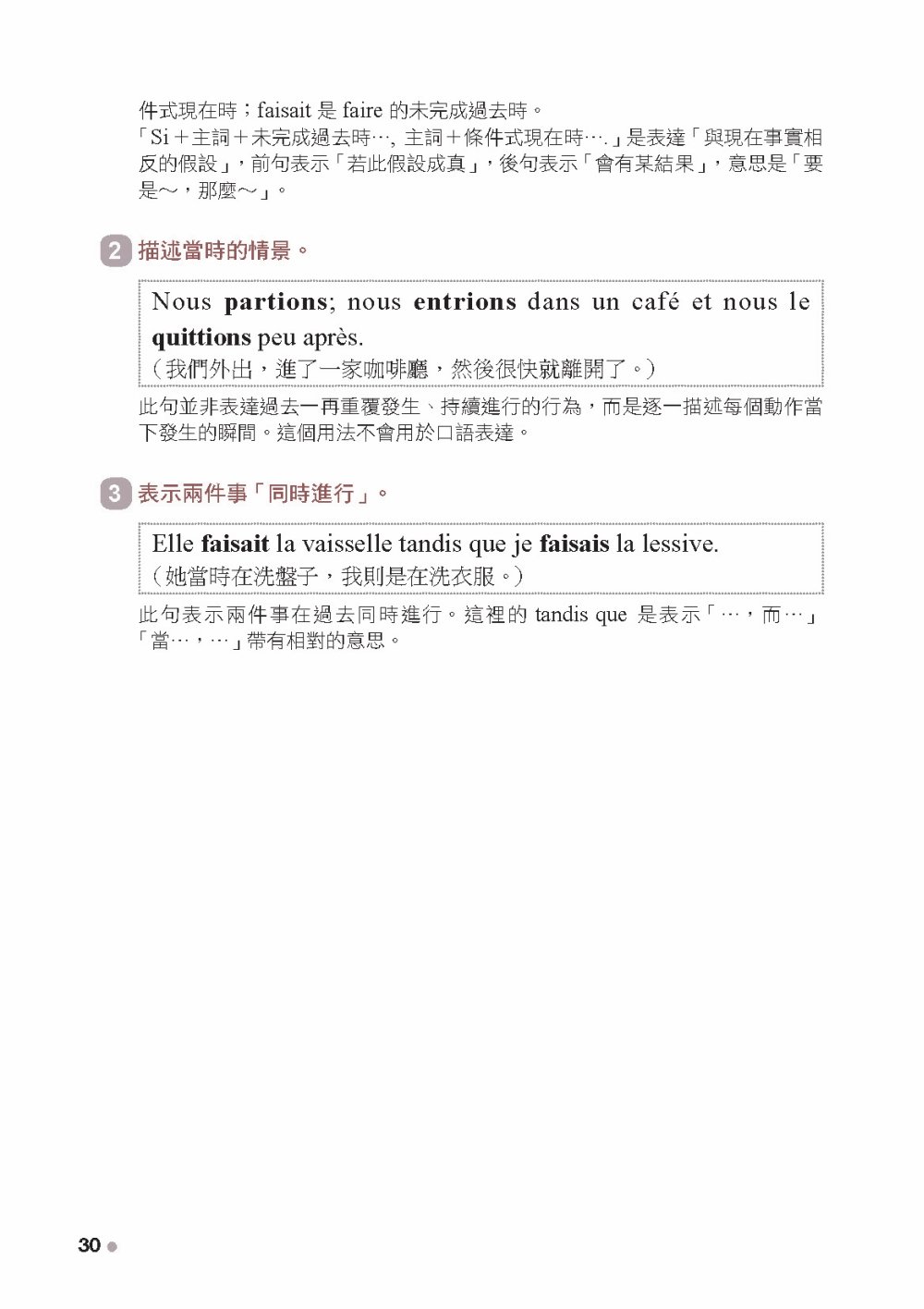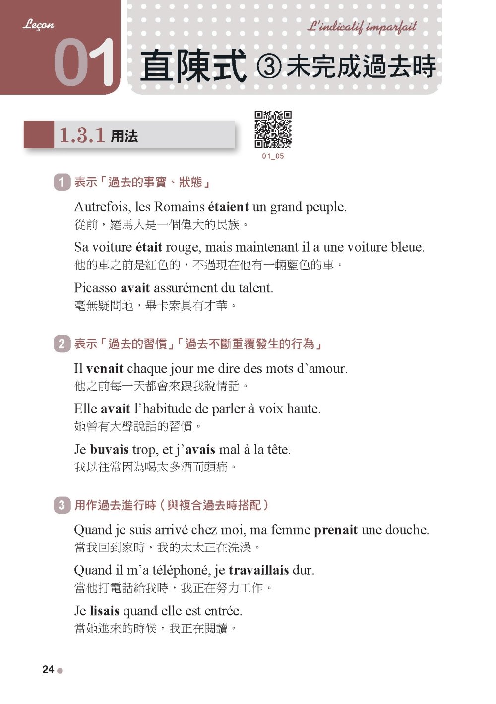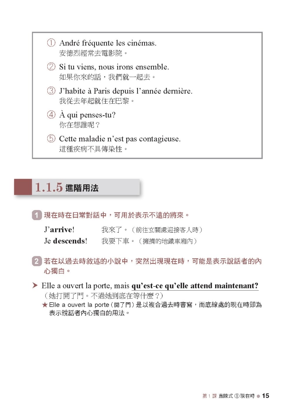 除了一般文法書會收錄的文法概念外,本書還整理了如文學作品中才會出現的用法,以及比較細微、難解釋的表達方式,讓你的法語程度就此脫離初級,提升到中高級程度。比如在小說中,在以過去時書寫的敘述中突然出現「直陳式現在時」的話,那可能是表示說話者的內心獨白。